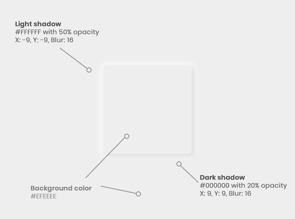 What will it take to get started making neumorphic interfaces ourselves? Let’s take a look at the basic components, which are pretty simple in and of itself. Looking at a simple card we can see that we need a slight grey tone as our page’s background to contrast with the light highlight shadow. The card itself has the same background color and boasts not one but two shadows! A light shadow casting to the top-left corner and a darker shadow casting to the bottom-right corner. These simple components compose the basics of the style, which can obviously be experimented with further in different shapes and forms.