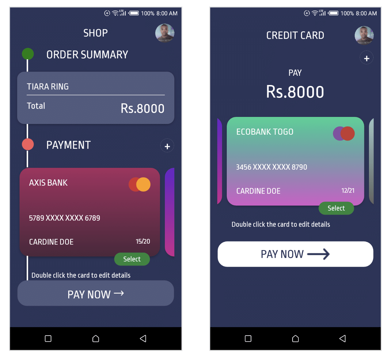 Another cool sample comes from Kodjo Laurent Egbakou who added not one but three (!) snippets at the same time. Among them was this cool credit card app which he based on an existing Dribbble design.