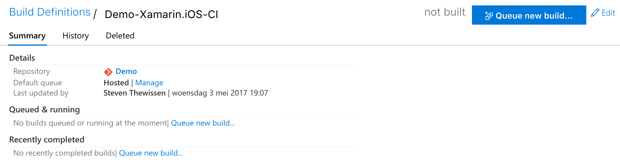 We start by editing the build definition we created in one of our previous posts by navigating to it and clicking the Edit button.