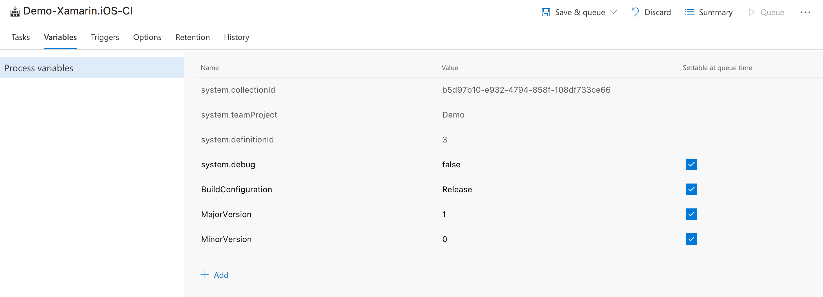 This step will now take the Build Number and inject that into the version string it can find in the Info.plist file. But the problem is that your build number looks something like this out of the box: 20170520.01. That’s not quite the format we’re looking for. The format used can be set in the Options tab in your build definition. My preferred method is to have a major and minor version I can set for myself and an automated ID appended to it as the build number. Luckily VSTS has some built-in variables we can use for that! First let’s start by creating two variables called MajorVersion and MinorVersion and set them to 1 and 0. You can make them settable at queue time if you want and I update these when necessary before a release.