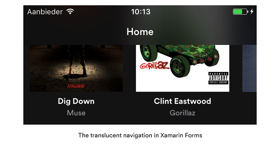 The translucent NavigationBar takes a bit more effort and we fix that by using a custom renderer. We start by removing any background images and shadow images from the NavigationBar instance and set it to be translucent. When that is done we add an instance of a UIVisualEffectView to the back of our NavigationBar. This is a native UIView that can give one of a few effects to another UIView. In this case we use the UIBlurEffect which blurs whatever passes through our navigation bar.